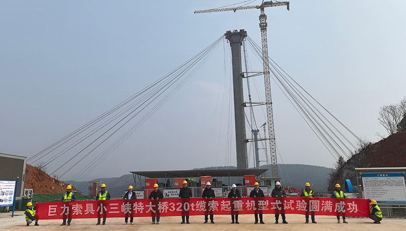 由巨力索具研發(fā)的丹江小三峽特大橋纜索起重機(jī)系統(tǒng)順利完成安裝調(diào)試,成功完成首節(jié)鋼箱梁吊裝,標(biāo)志著這一國(guó)家重點(diǎn)橋梁工程邁入主體施工的關(guān)鍵階段。