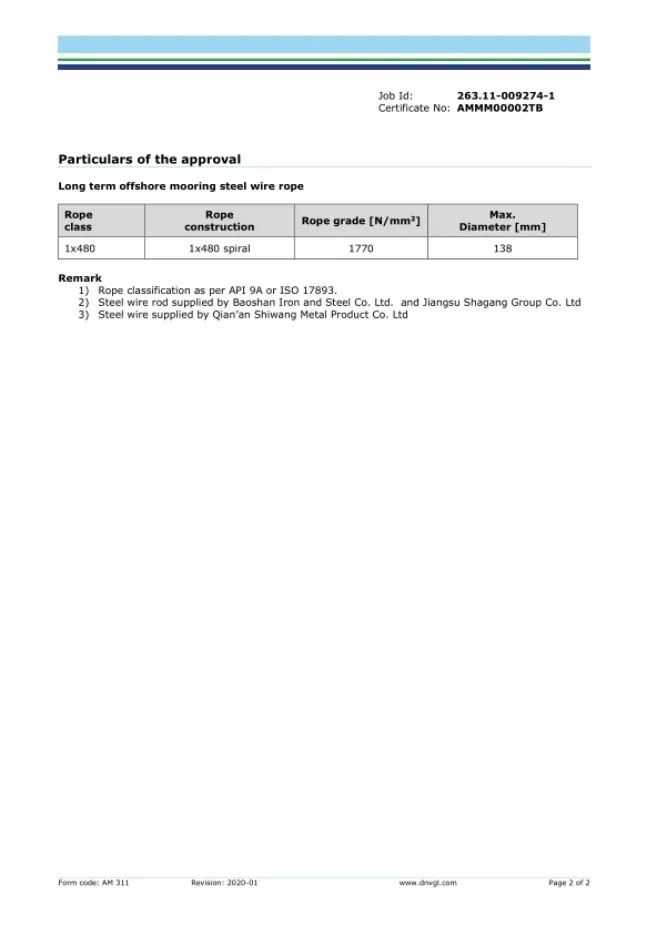 2020年11月,巨力索具取得了永久系泊用單股涂塑鋼絲繩的DNV·GL工廠認可證書,成為國內首家通過該類鋼絲繩DNV·GL工廠認可的廠家。